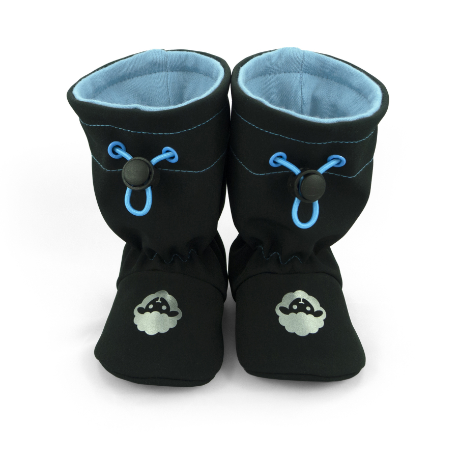 Je už Vaše dítko pohybově zdatné, ale ještě nechodí? Přímo pro něj jsou určeny tyto softshellové capáčky, které užije jednak při svých průzkumech terénu, ale také ho zahřejí v kočárku, šátku či nosítku lépe než klasické botičky (ty obepínají nožku příliš těsně a neumožňují dostatečné prokrvení ve stabilní/nehybné poloze). Svrchní softshellová vrstva zajistí ochranu nožky před vnějšími vlivy jako je chlad a vlhko, snadno se udržuje, neboť při mírném ušpinění stačí capáčky otřít vlhkým hadříkem. Ale lze je samozřejmě i prát. Vnitřek capáčků je „vystlán“ Merino úpletem vyšší gramáže, který zajistí dětské nožičce absolutní komfort (Merino je antibakteriální a hypoalergenní, výborně odvádí pot a má skvělé termoregulační schopnosti, takže umí hřát i když se miminko zpotí). Upevnění na nožičce zajišťuje stažení nad kotníčkem a také gumička s brzdičkou kolem lýtka, kterou si utáhnete dle potřeby. Na špičce botičky je umístěn reflexní obrázek, který je jednak praktickým ochranným prvkem např. v nosítku, ale také dokáže zaujmout a zabavit malého nositele.