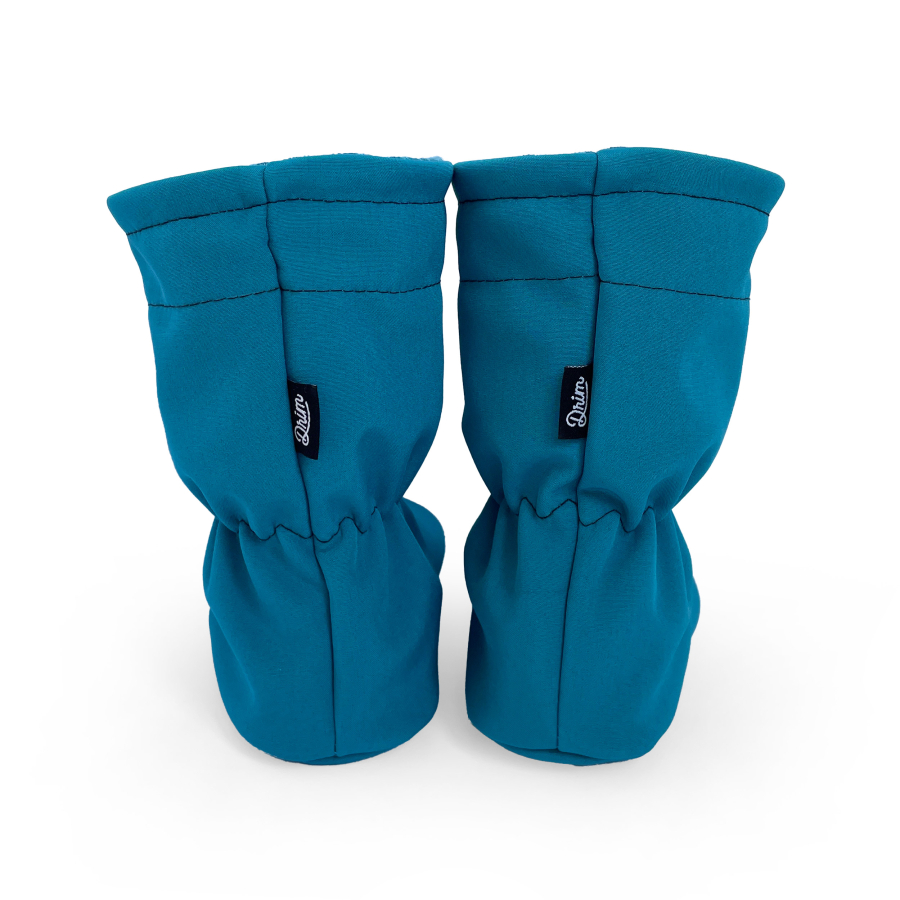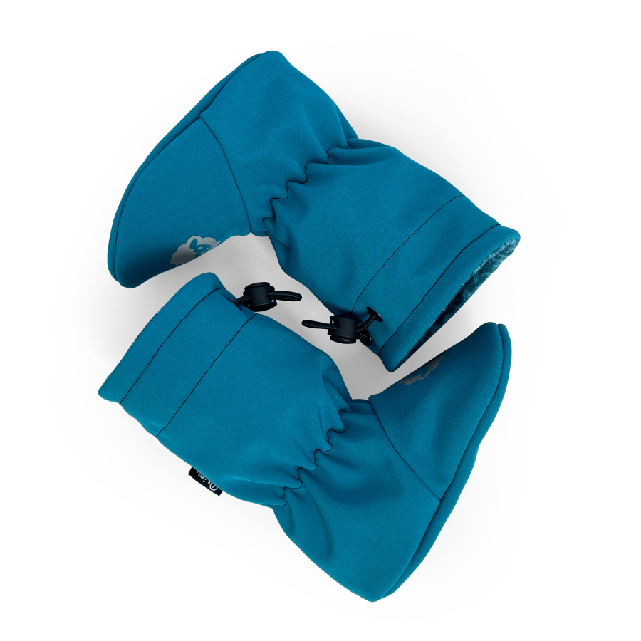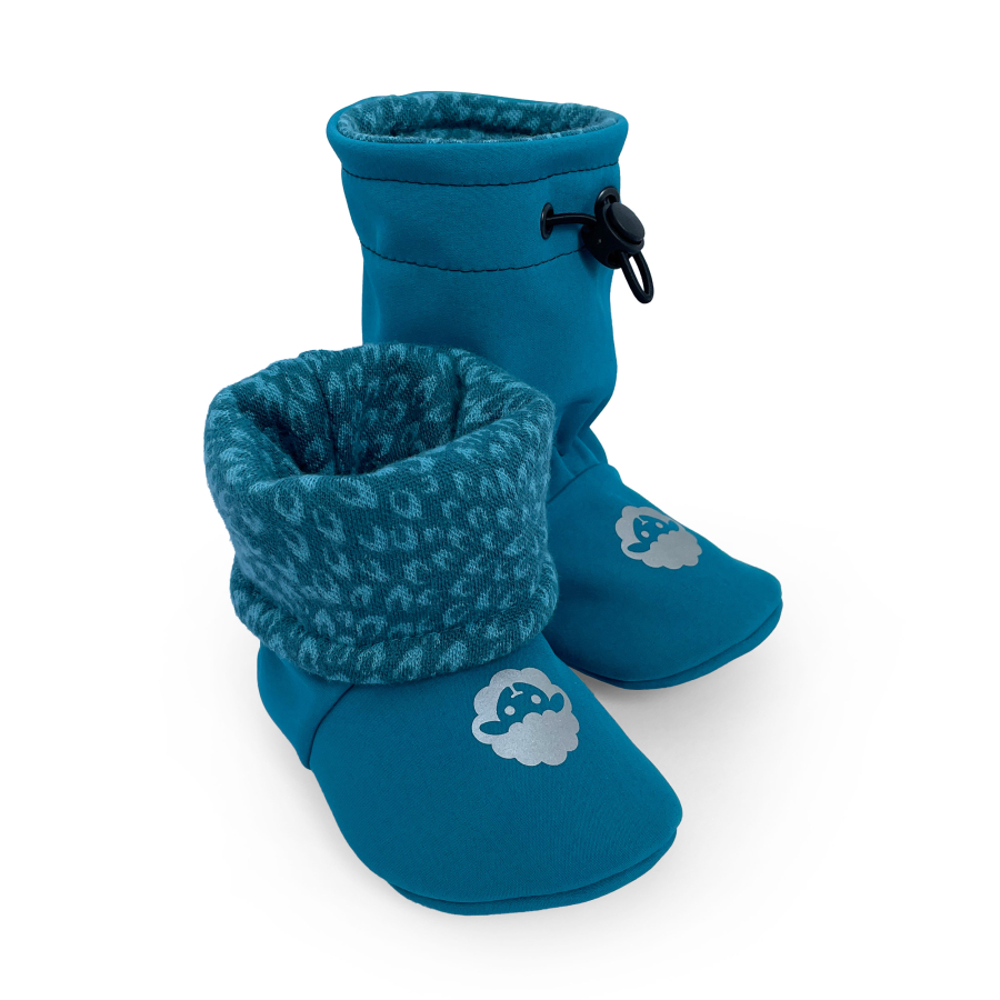 Je už Vaše dítko pohybově zdatné, ale ještě nechodí? Přímo pro něj jsou určeny tyto softshellové capáčky, které užije jednak při svých průzkumech terénu, ale také ho zahřejí v kočárku, šátku či nosítku lépe než klasické botičky (ty obepínají nožku příliš těsně a neumožňují dostatečné prokrvení ve stabilní/nehybné poloze). Svrchní softshellová vrstva zajistí ochranu nožky před vnějšími vlivy jako je chlad a vlhko, snadno se udržuje, neboť při mírném ušpinění stačí capáčky otřít vlhkým hadříkem. Ale lze je samozřejmě i prát. Vnitřek capáčků je „vystlán“ Merino úpletem vyšší gramáže, který zajistí dětské nožičce absolutní komfort (Merino je antibakteriální a hypoalergenní, výborně odvádí pot a má skvělé termoregulační schopnosti, takže umí hřát i když se miminko zpotí). Upevnění na nožičce zajišťuje stažení nad kotníčkem a také gumička s brzdičkou kolem lýtka, kterou si utáhnete dle potřeby. Na špičce botičky je umístěn reflexní obrázek, který je jednak praktickým ochranným prvkem např. v nosítku, ale také dokáže zaujmout a zabavit malého nositele.